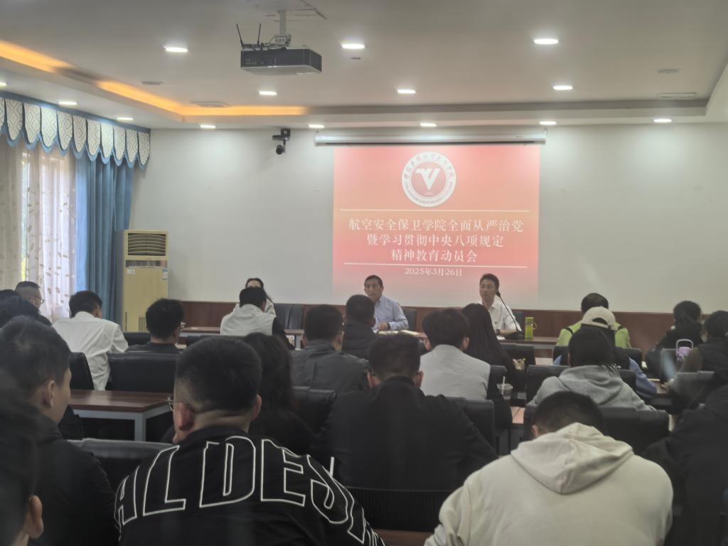 为深入贯彻中央、民航局党组以及学院党委关于全面从严治党的战略部署,推动全面从严治党向纵深发展,深化党风廉政建设,不断朝着更高标准、更严要求稳步前行。航空安全保卫学院党委于3月26日,在羽毛球馆会议室召开2025年全面从严治党暨学习贯彻中央八项规定精神教育动员会,安保学院全体党员参会,会议由党委书记王旭主持。