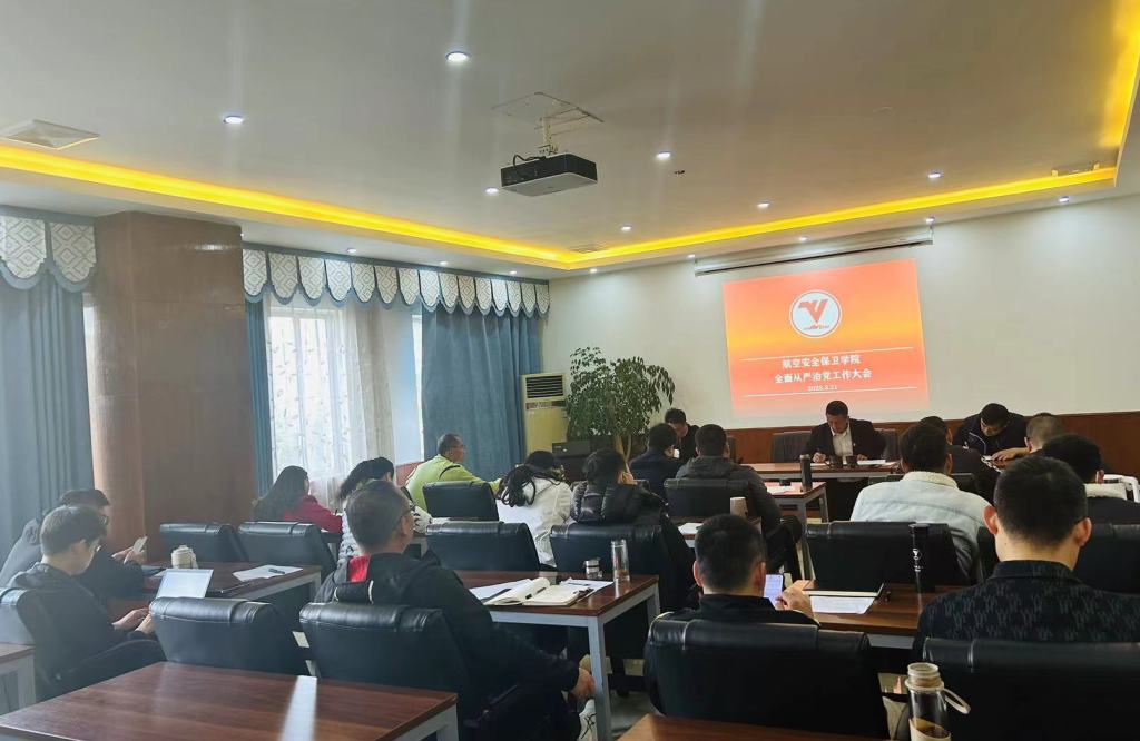 本网讯 安保学院 报道:为坚定不移推进全面从严治党,深入贯彻落实好中央、民航局党组以及学院党委有关全面从严治党部署;航空安全保卫学院于3月21日上午,在羽毛球馆二楼会议室召开2023年全面从严治党工作会,安保学院副科级以上领导干部、党务秘书、学院纪检委员参加了会议。会议由安保学院党委书记王旭主持。