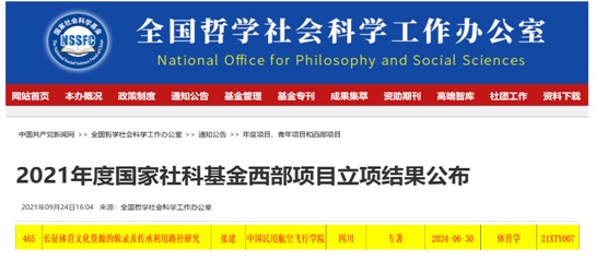近日,全国哲学社会科学工作办公室对2021年国家社科基金西部项目立项结果进行了公布。我院张建副教授申报的《长征体育文化资源的辑录及传承利用路径研究》项目获批立项。长征精神是党中央批准第一批纳入中国共产党人精神谱系的伟大精神。该课题以“红”促“体”,以“体”衬“红”,依托红色体育文化资源,实现“长征精神”与“中华体育精神”的深度融合,探索长征体育文化资源的现代化传承利用路径,努力将红色体育文化资源注入体育强国伟大梦想中。