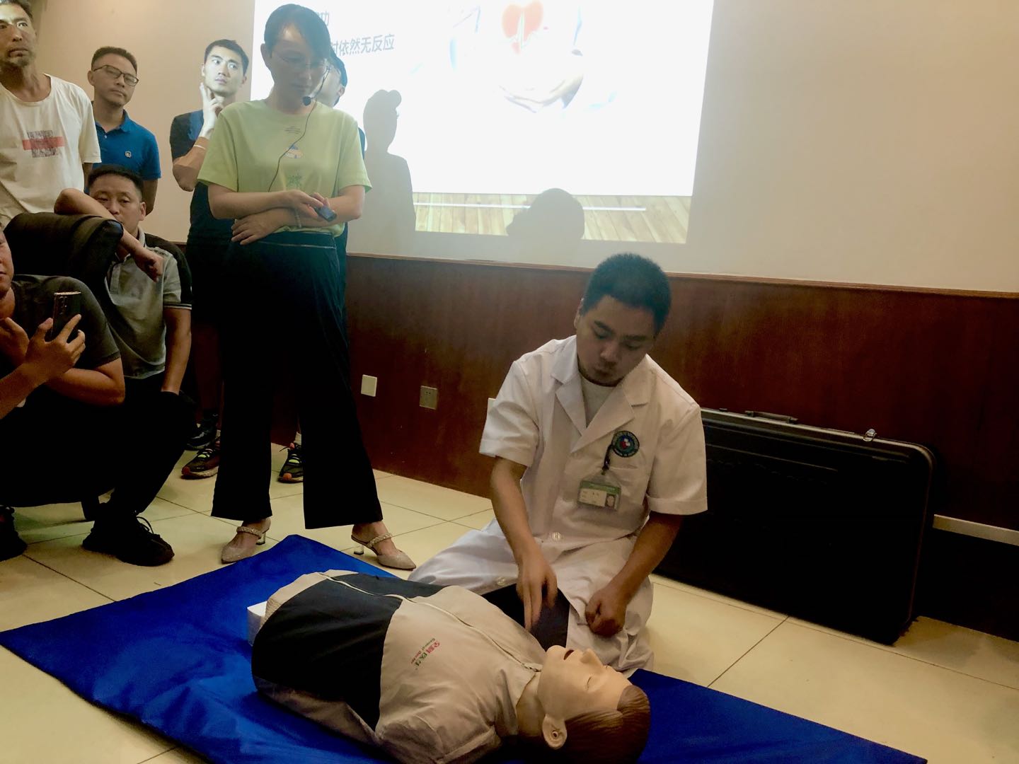 讲座分为三个主题:酒精中毒、中暑、心肺复苏,针对体育教学训练过程中较容易发生的中暑问题,张雪医生重点讲解了劳力性中暑的预防、中暑症状的识别和现场急救,借助心肺复苏模拟人教具,张雪医生现场演示了心肺复苏的全流程,并且在医生的指导下,老师们纷纷参与,体验了心肺复苏的操作要领和技巧,使大家收获颇丰。